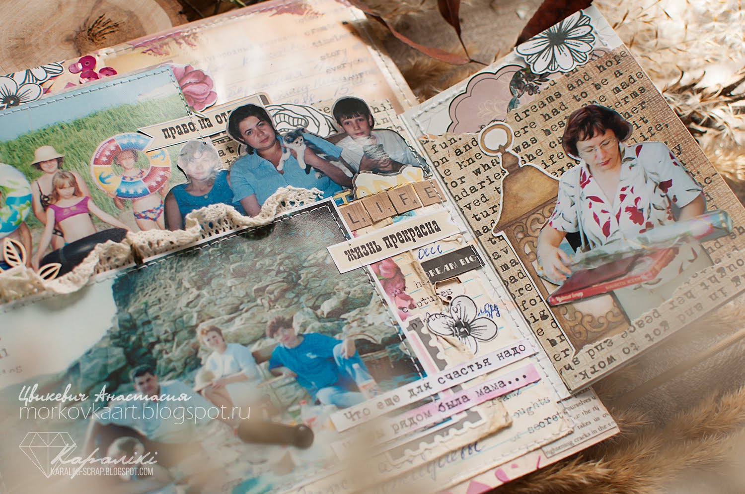 Вторая страница разворота посвящена довольно большому периоду маминой жизни. Здесь мы и совсем малыши и уже школьники. Декора очень много, как я люблю последнее время. Для фона использовала уже полюбившуюся коллекцию "Солнечная кухня" , а вырезанные цветочки из "Свадьбы в стиле бохо"